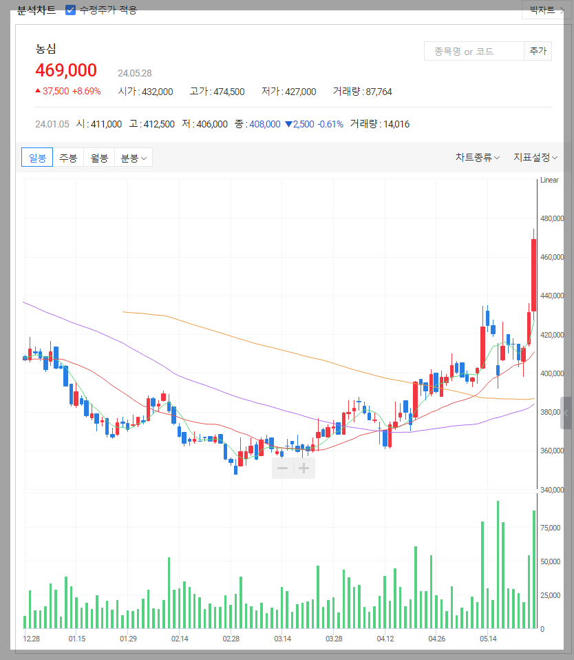 농심 전일 주가는 431,500원이며 전일 대비 +37,500원의 모습을 보이고 있습니다. 농심의 주주현황을 살펴보면 농심홀딩스 주주가 전체 지분 44.29%를 소유하고 있습니다. 농심은 식료품 기업으로 장중 기준으로 주가는 431,500원입니다. 농심의 시가 총액은 2조 8528억 원이며 발행 주식수는 6,082,642주입니다. 외국인 보유 비중은 20.27%이며 장중 거래량은 54,549원 을 기록했습니다. 매출액은 8,725억 원을 달성했습니다. EPS는 30,537원이며 농심 주식 배당수익률은 1.23%입니다.