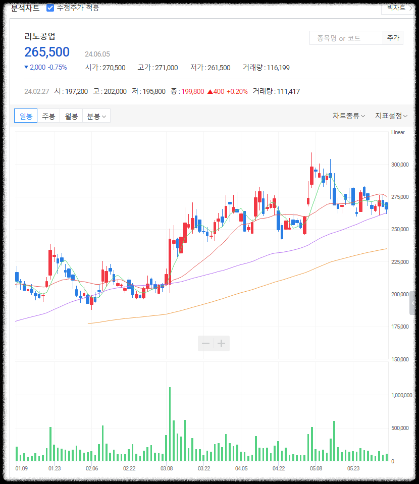리노공업의 현재 주가는 265,500원이며, 전일 대비 2,000원 하락했습니다. 주주 현황을 보면, 이채윤 주주가 전체 지분의 34.66%를 보유하고 있습니다. 반도체 및 관련 장비를 제조하는 리노공업의 주가는 장중 265,500원을 기록했습니다. 시가총액은 4조 468억 원이며, 발행 주식 수는 15,242,370주입니다. 외국인 보유 비중은 34.34%이고, 장중 거래량은 118,338주를 기록했습니다. 매출액은 549억 원, EPS는 7,277원이며, 리노공업의 주식 배당수익률은 1.48%입니다.