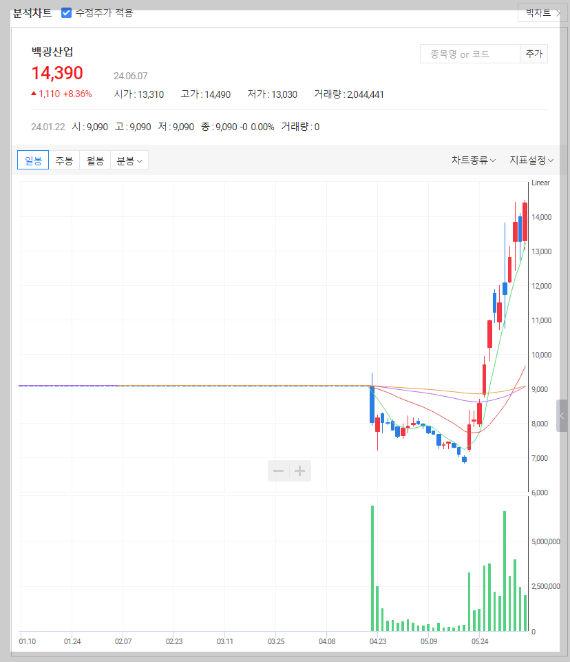 기업 가치 평가에는 다양한 방법이 사용되지만, 그중에서 기술 지표를 활용하는 방법을 소개합니다. 백광산업은 전체 기술주 기업 중 등급인 입니다. 대표 섹터 평가 기업 중 등급인 입니다. 대표 테마 평가 기업 중에서는 를 차지했습니다. 이를 바탕으로 투자 매력도를 평가해 보면 전체 기술주, 대표 섹터, 대표 테마의 결과를 얻을 수 있습니다.