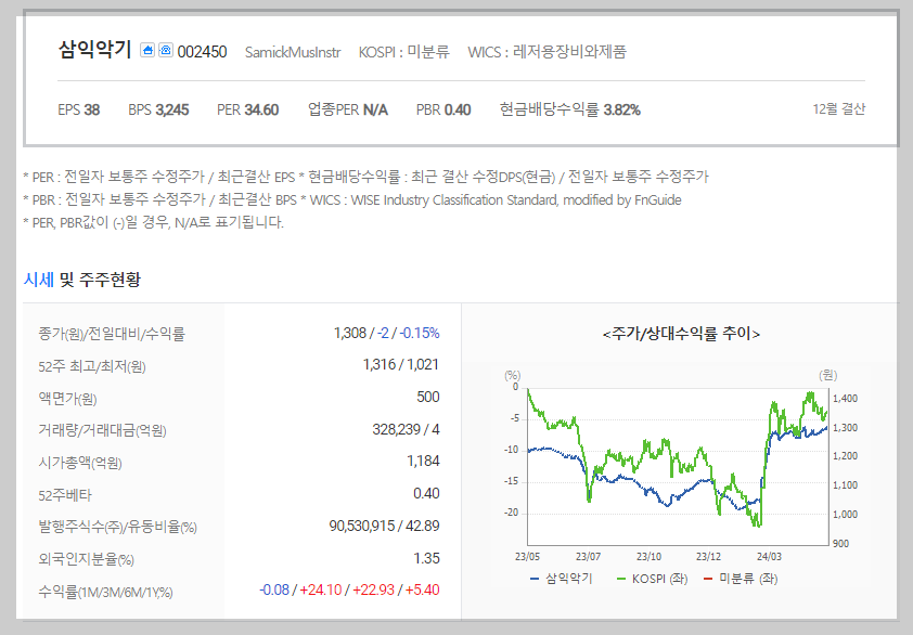 삼익악기 전일 주가는 1,308원이며 전일 대비 +92원의 모습을 보이고 있습니다. 삼익악기의 주주현황을 살펴보면 김종섭 주주가 전체 지분 41.43%를 소유하고 있습니다. 삼익악기는 레저용품 기업으로 장중 기준으로 주가는 1,308원입니다. 삼익악기의 시가 총액은 1279억 원이며 발행 주식수는 90,530,915주입니다. 외국인 보유 비중은 1.35%이며 장중 거래량은 328,239원 을 기록했습니다. 매출액은 2,479억 원을 달성했습니다. EPS는 없음원이며 삼익악기 주식 배당수익률은 2.21%입니다.