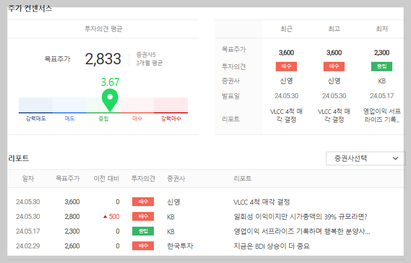 KB증권은 31일 대한해운에 대해 최근 공시한 유조선 매각에 따른 유형자산처분이익 규모가 시가총액의 38.8%에 이른다며 투자의견을 기존 중립에서 ‘매수’로, 목표주가를 기존 2300원에서 2800원
