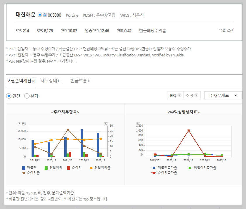 -2023년 12월 전년동기 대비 연결기준 매출액은 13.3% 감소, 영업이익은 6.6% 감소, 당기순이익은 56.7% 감소. 시황, 유가 하락에 따른 원가보상 감소로 매출과 영업이익이 감소하고, 환율변동에 따른 외환이익감소와 금리상승에 따른 이자비용증가로 당기순이익도 감소. 매출액은 1조 3,974억 원, 영업이익은 2,500억 원을 기록함. 용선시장의 불확실성과 관련된 위험을 최소화하여 안정적인 영업과 이익 극대화를 위해 노력 중임.