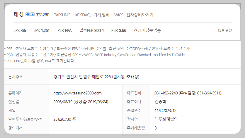 태성은 전자 장비 및 기기 기업입니다. 대표자는 김종학이며 설립일은 2019/04/05, 주식 상장일은 2019/06/24입니다. 전체 종업원 수는 116명이고 본사 주소는 경기도 안산시 단원구 해안로 228 (원시동, ㈜태성)입니다.