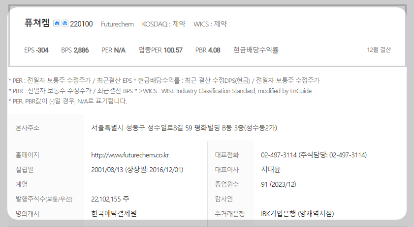 퓨쳐켐은 제약 기업입니다. 대표자는 지대윤이며 설립일은 2001/08/13, 주식 상장일은 2016/12/01입니다. 전체 종업원 수는 91명이고 본사 주소는 서울특별시 성동구 성수일로 8길 59 평화빌딩 B동 3층(성수동 2가)입니다.