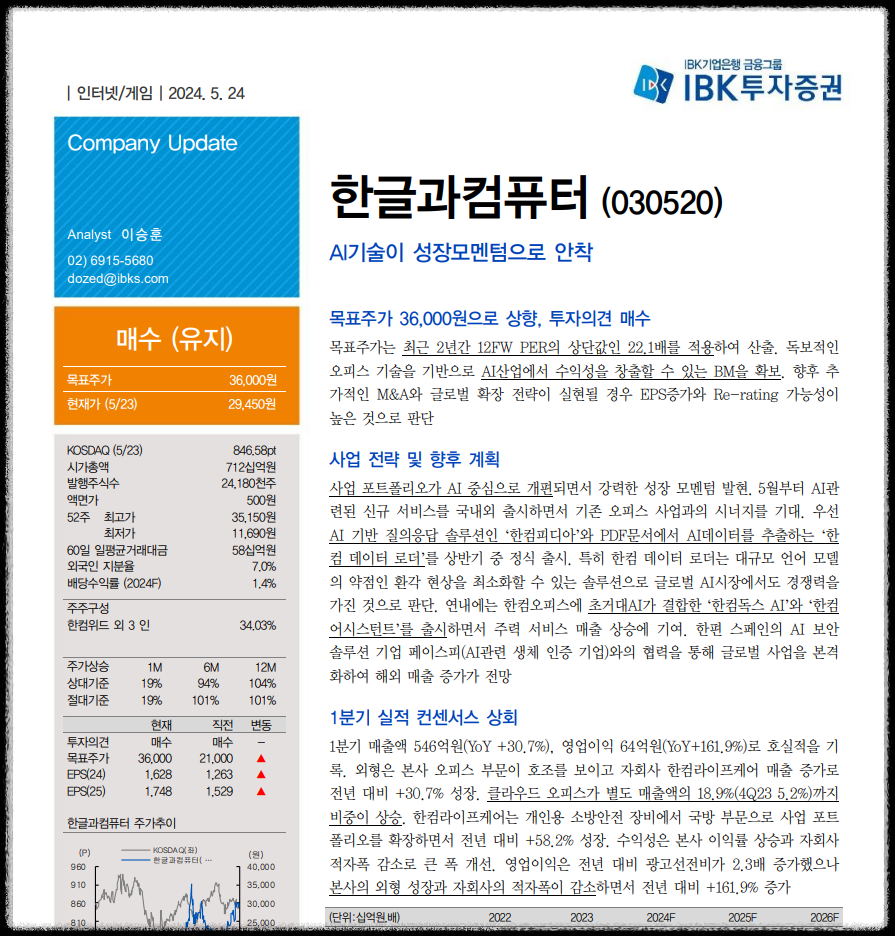 IBK증권. 한글과컴퓨터 목표가↑…"AI 중심 성장 모멘텀"