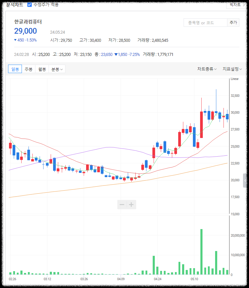 한글과컴퓨터 현재 주가는 29,000원이며 전일 대비 -450원의 모습을 보이고 있습니다. 한글과컴퓨터의 주주현황을 살펴보면 한컴위드 주주가 전체 지분 34.03%를 소유하고 있습니다. 한글과컴퓨터는 일반 소프트웨어 기업으로 장중 기준으로 주가는 29,000원입니다. 한글과컴퓨터의 시가 총액은 7012억 원이며 발행 주식수는 24,179,744주입니다. 외국인 보유 비중은 7.05%이며 장중 거래량은 2,520,330원 을 기록했습니다. 매출액은 546억 원을 달성했습니다. EPS는 1,644원이며 한글과컴퓨터 주식 배당수익률은 2.87%입니다.