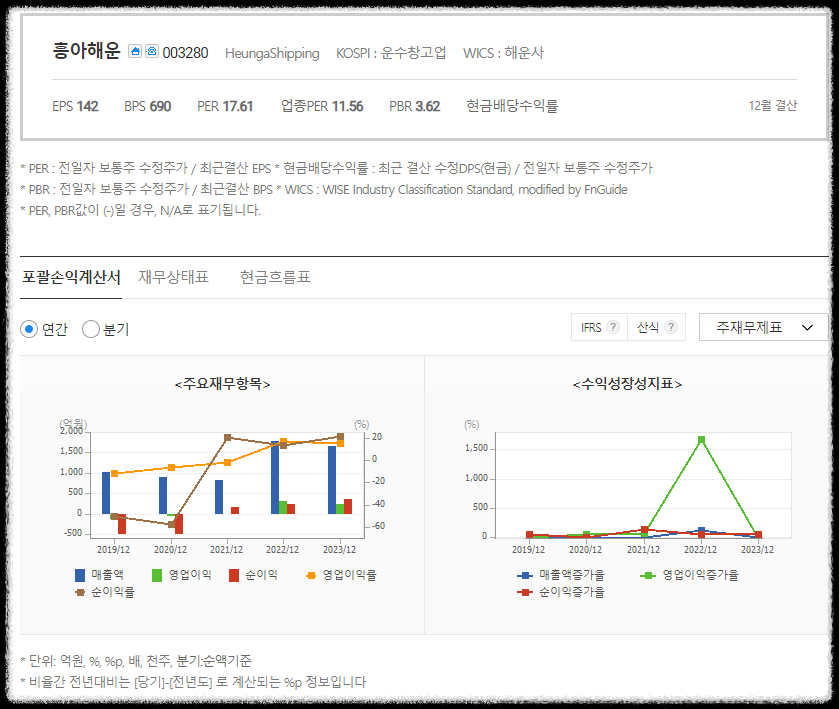 -2023년 12월 전년동기 대비 연결기준 매출액은 7.3% 감소, 영업이익은 17.2% 감소, 당기순이익은 50.6% 증가함. 코로나 펜데믹, 우크라이나사태등의 어려운 환경에도 외형확장 및 사업다변화 노력의 결과, 매출액은 소폭감소, 당기순이익은 증가함. 별도 기준 당기순이익도 전년동기 대비 52% 증가한 212억 원을 기록함. 동사는 다양한 선단을 구성하여 고객의 니즈 및 마켓 상황에 능동적으로 대처하며, 선박운용을 하고 있음.