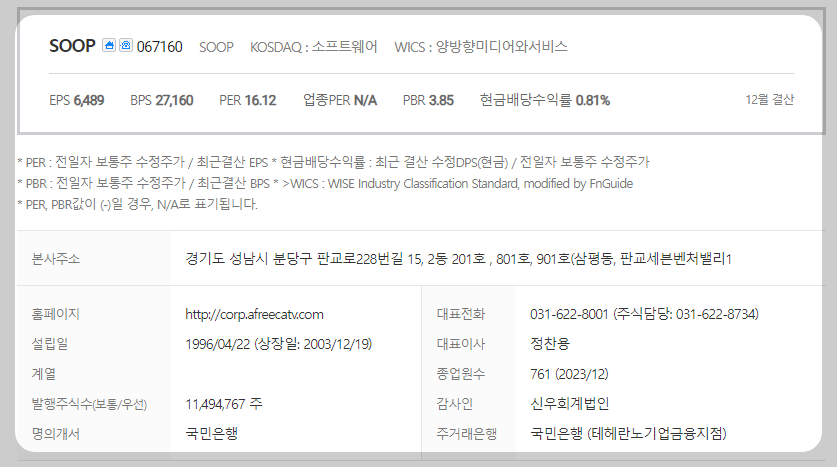 SOOP는 인터넷 서비스 기업입니다. 대표자는 정찬용이며 설립일은 1996/04/22, 주식 상장일은 2003/12/19입니다. 전체 종업원 수는 761명이고 본사 주소는 경기도 성남시 분당구 판교로 228번 길 15 (삼평동, 판교세븐벤처밸리 1단지 2동 201, 801, 901호)입니다.